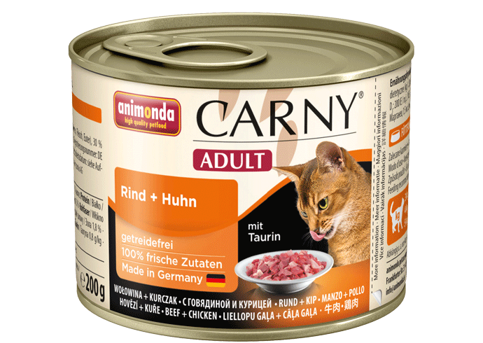 Animonda Carny to wysokiej jakości, pełnoporcjowe karmy dla kotów. Koty są z natury mięsożercami, dlatego Animonda Carny przygotowywane są wyłącznie z wysokiej jakości, starannie wyselekcjonowanych mięsnych składników. Nie zawierają konserwantów, sztucznych aromatów i barwników, oraz soi i innych genetycznie modyfikowanych składników. Carny jest produktem naturalnym, o smaku prawdziwego mięsa, który koty uwielbiają ponad wszystko. To idealna odpowiedź na potrzeby żywieniowe Twojego kota.