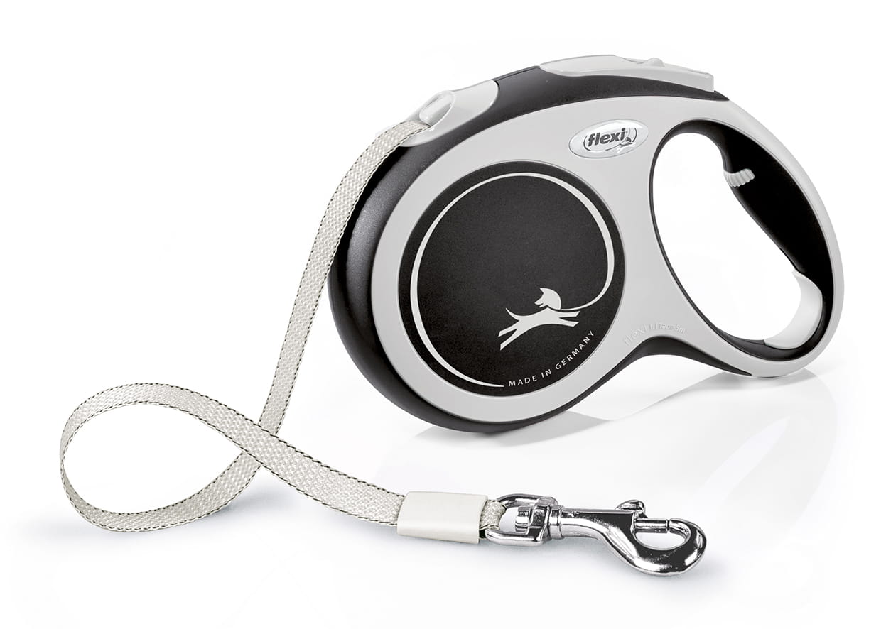 Smycz automatyczna New Comfort L idealna dla psów o wadze do 60 kg. 5-metrowa solidna taśma zapewnia psu maksymalną wolność podczas spacerów, jednocześnie zapewniając Tobie kontrolę nad nim, dzięki zastosowaniu funkcji blokady rozwijania smyczy. Opatentowana kontrola zwijania sprawia, że smycz nie skręca się ani nie zahacza. Ergonomiczny uchwyt idealnie układa się w dłoni, można go indywidualnie regulować. Funkcjonalność smyczy można zwiększyć, dobierając dodatki takie jak: pojemnik Multi Box, w którym możesz przechowywać przekąski lub woreczki na odchody czy przypinaną na rzepy lampkę LED Lighting.