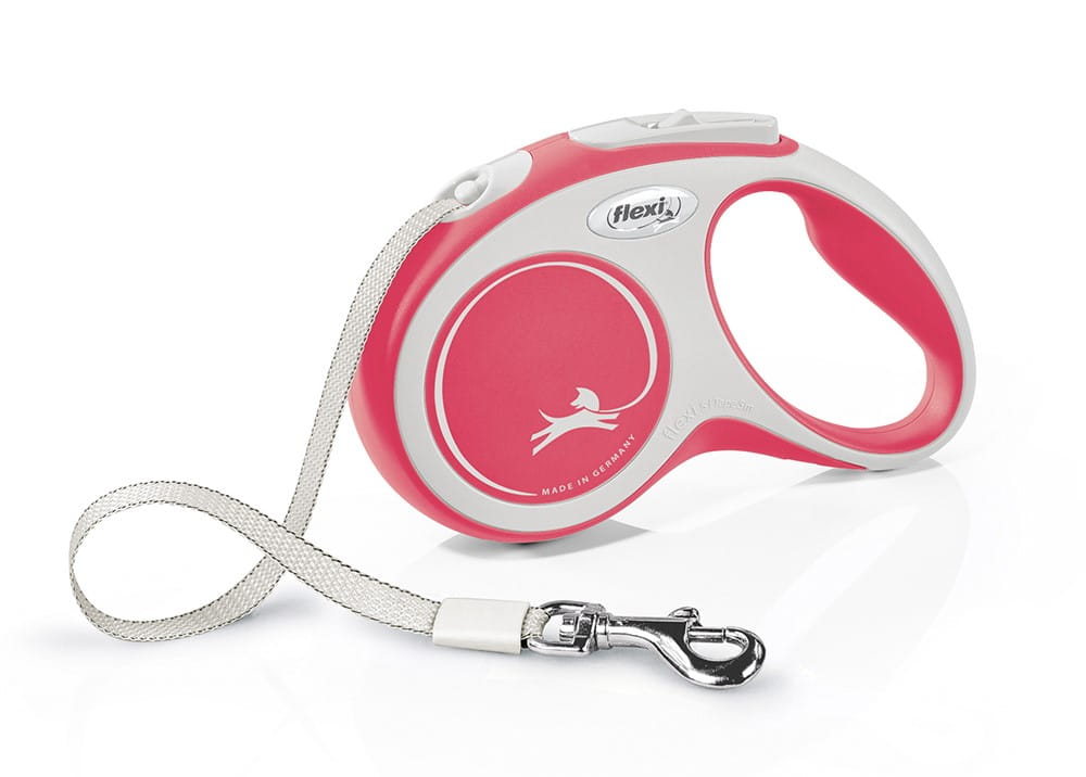 Smycz automatyczna New Comfort S idealna dla psów o wadze do 15 kg. 5-metrowa solidna taśma zapewnia psu maksymalną wolność podczas spacerów, jednocześnie zapewniając Tobie kontrolę nad nim, dzięki zastosowaniu funkcji blokady rozwijania smyczy. Opatentowana kontrola zwijania sprawia, że smycz nie skręca się ani nie zahacza. Ergonomiczny uchwyt idealnie układa się w dłoni. Funkcjonalność smyczy można zwiększyć, dobierając dodatki takie jak: pojemnik Multi Box, w którym możesz przechowywać przekąski lub woreczki na odchody czy przypinaną na rzepy lampkę LED Lighting.