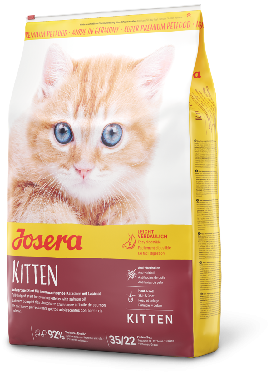 Josera Kitten jest energetyczną, lekkostrawną i szczególnie smaczną karmą dla dorastających kociąt. Idealna karma dla kociąt w pierwszych miesiącach życia, oraz dla ciężarnych i karmiących kotek. Starannie dobrane wysokiej jakości składniki zapewniają lepszą strawność nawet dla kotów z wrażliwym układem pokarmowym. Zrównoważona zawartość witamin, minerałów i mikroelementów wspiera zdrowy rozwój kociąt, a dodatek tauryny dba o dobrą przemianę materii, działa pozytywnie na wzrok i wzmacnia serce. Specjalne dietetyczne włókna ułatwiają usuwanie połkniętych włosów z przewodu pokarmowego, a tym samym zmniejszają ryzyko powstawania kul włosowych.
