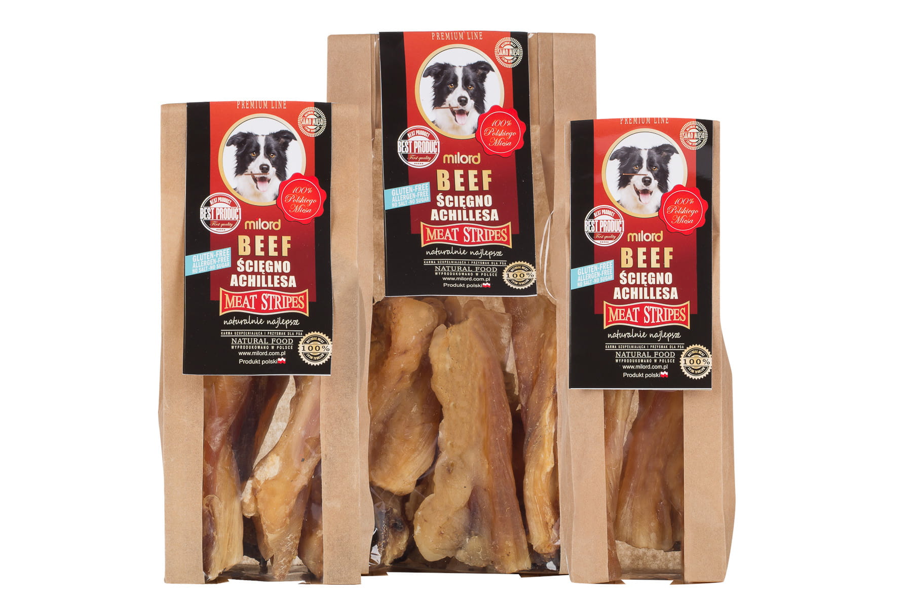 MILORD Przysmak dla Psa Ścięgna Wołowe Achillesa to doskonałe naturalne gryzaki, stworzone z myślą o zaspokojeniu naturalnych instynktów żucia Twojego psa. Wyprodukowane wyłącznie ze ścięgien wołowych polskiego pochodzenia, te przysmaki to nie tylko smaczna przekąska, ale także doskonałe zajęcie dla psa każdej wielkości.