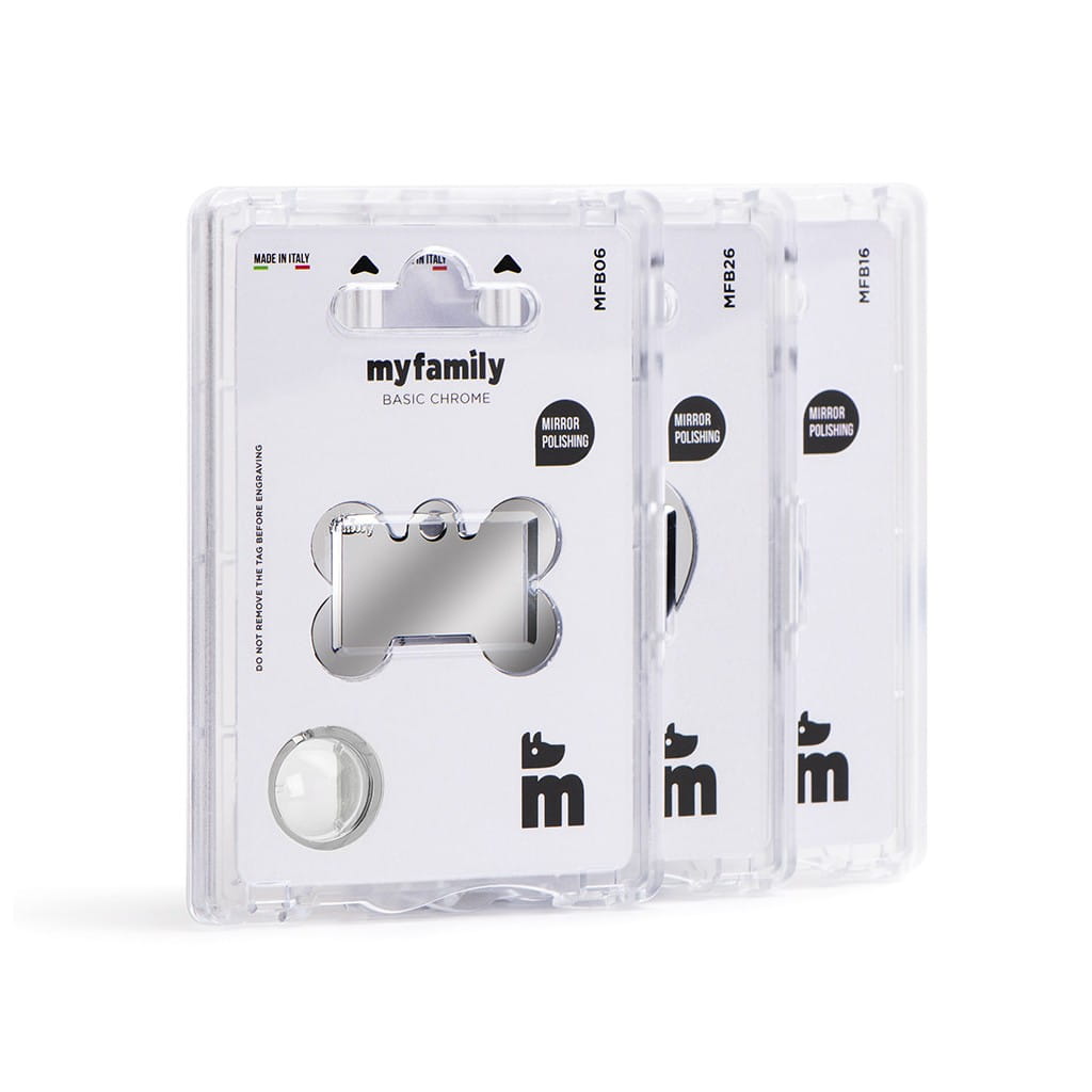 MyFamily Basic to maksymalna prostota i elegancja. Dostępne w wersji z anodowanego aluminium (kolorowe), chromowanej i pozłacanego mosiądzu. Nowa wzmocniona wersja sprawia, że identyfikatory są bardziej odpornie niż kiedykolwiek. Dla większych psów - tych naprawdę dużych rozmiarów - dostępna jest kolekcja XL. Jedno jest pewne: każdy zwierzak znajdzie swój "szyty na miarę" identyfikator MyFamily.