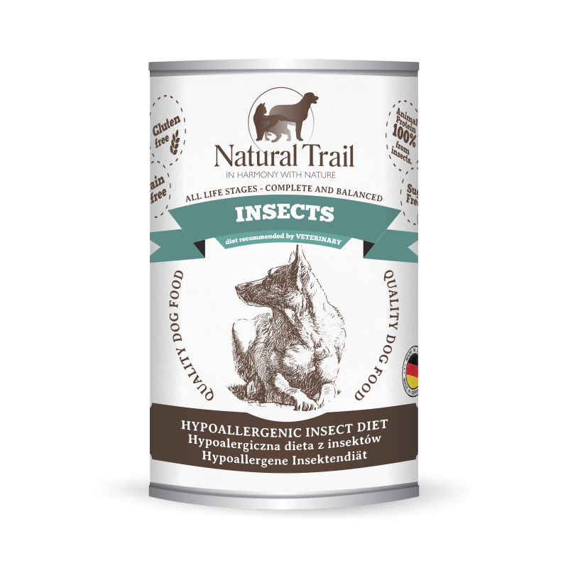 Natural Trail INSECTS to doskonale zbilansowana, kompletna i smakowita karma mokra dla psów. Wyprodukowana jest ze starannie wyselekcjonowanego świeżego mięsa, nie zawiera zbóż. Na smakowitych oraz łatwych do pogryzienia kawałeczkach widać naturalną strukturę mięsa. Pies jest zwierzęciem mięsożernym. Jego organizm domaga się odpowiedniej diety. W naszej ofercie można znaleźć diety monobiałkowe doskonałe dla alergików.