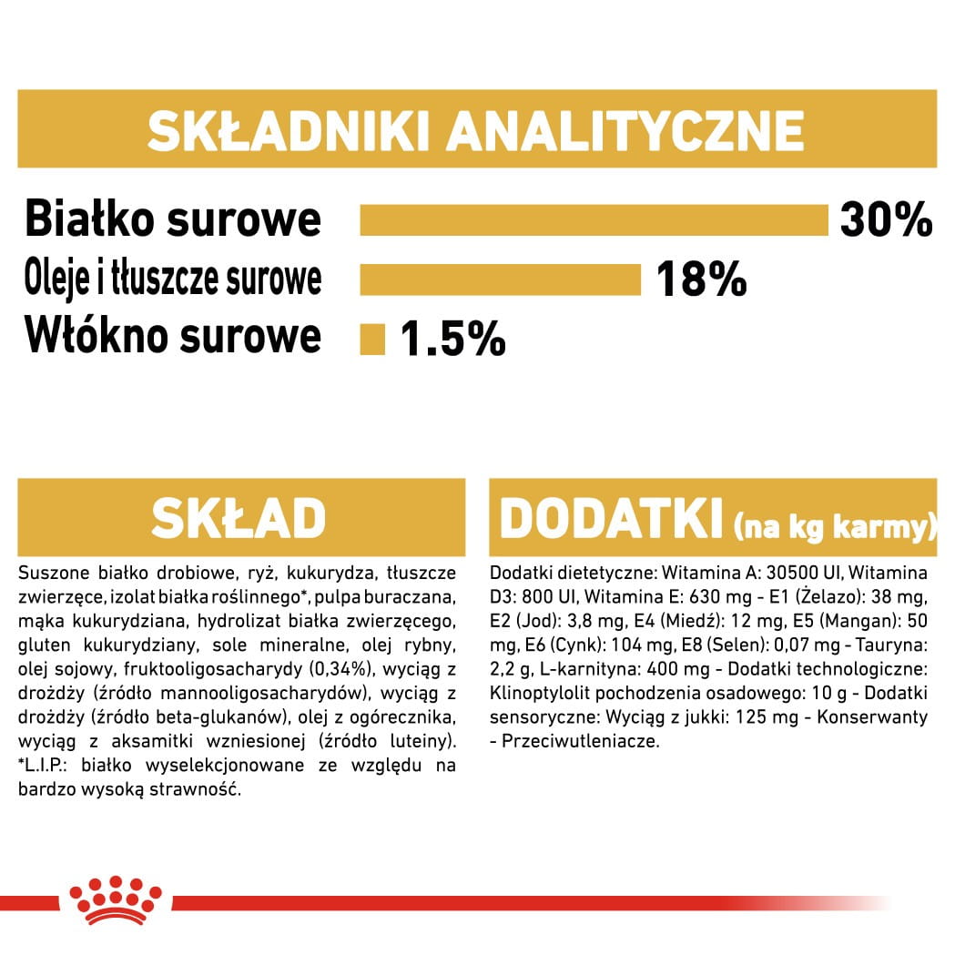Skład: suszone białko drobiowe, ryż, kukurydza, tłuszcze zwierzęce, izolat białka roślinnego*, pulpa buraczana, mąka kukurydziana, hydrolizat białka zwierzęcego, gluten kukurydziany, sole mineralne, olej rybny, olej sojowy, fruktooligosacharydy (0,34%), wyciąg z drożdży (źródło mannooligosacharydów), wyciąg z drożdży (źródło beta-glukanów), olej z ogórecznika, wyciąg z aksamitki wzniesionej (źródło luteiny).