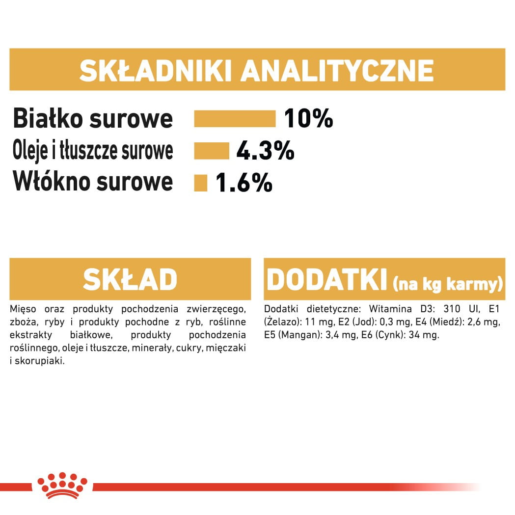 Składniki analityczne: Białko surowe: 10% - Oleje i tłuszcze surowe: 4,3% - Popiół surowy: 1,4% - Włókno surowe: 1,6% - Wilgotność: 78%.