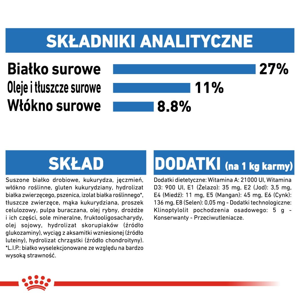 Skład: suszone białko drobiowe, kukurydza, jęczmień, włókno roślinne, gluten kukurydziany, hydrolizat białka roślinnego*, tłuszcze zwierzęce, mąka kukurydziana, proszek celulozowy, pulpa buraczana, olej rybny, drożdże i ich części, sole mineralne, fruktooligosacharydy, olej sojowy, hydrolizat skorupiaków (źródło glukozaminy), wyciąg z aksamitki wzniesionej (źródło luteiny), hydrolizat chrząstki (źródło chondroityny).