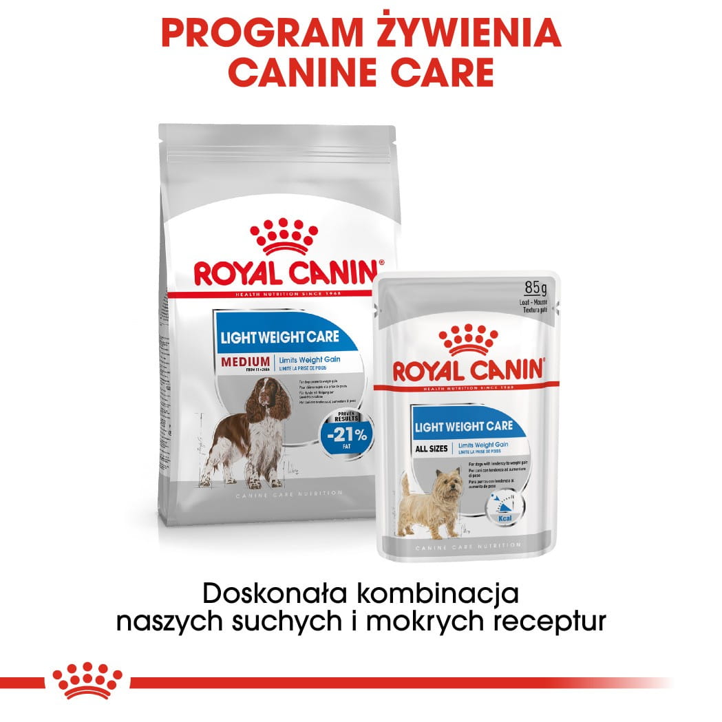 Karma ROYAL CANIN® Light Weight Care Medium, odpowiednia dla psów dorosłych o masie ciała od 11 do 25 kg, pomaga zapobiegać nadwadze.