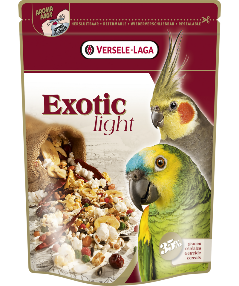 Versele Laga Exotic Light to przysmak, który średnie i duże papugi uwielbiają. Dzięki niemu mogą delektować się wieloma prażonymi ziarnami (takimi jak preparowana kukurydza i preparowana pszenica) oraz bogatą mieszanką owoców i nasion. Mieszanka może być podawana jako nagroda, albo w połączeniu z nasionami Versele Laga, jako pokarm podstawowy.